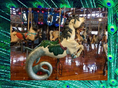 This carrousel gets bonus points for being beautifully accessible; the wide entrance ramp is shiny wood that matches the base of the ride. The figure in front of each chariot swivels and the chariot seat flips up to make room for a wheelchair.